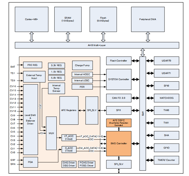 芯片內(nèi)置RTOS、鋰電池控制邏輯、電芯均衡邏輯和SOX(SOH、SOC、SOP、SOE)深度學(xué)習(xí)預(yù)測(cè)模型,客戶無需編程通過參數(shù)選擇就能快速完成BMS系統(tǒng).